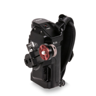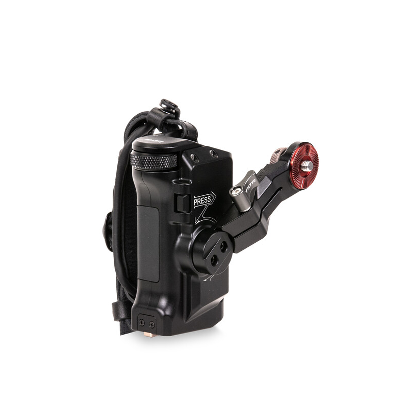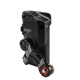 La poignée se fixe sur le côté de votre cage Tiltaing à l'aide de l'adaptateur de poignée droite dédié Type IV, V ou VI de votre choix. Chacun de ces adaptateurs de montage utilise un type de fixation différent, comme une rosette ou un rail NATO. La poignée accepte une batterie Sony F570, vendue séparément. Un câble USB inclus relie la poignée à votre moteur Nucleus-Nano pour l'alimenter avec la batterie F570 et permettre le contrôle de la mise au point via la molette. La poignée dispose de deux connexions : une sortie USB Type-C régulée 8V où se branche le câble USB et une sortie 12 VDC.