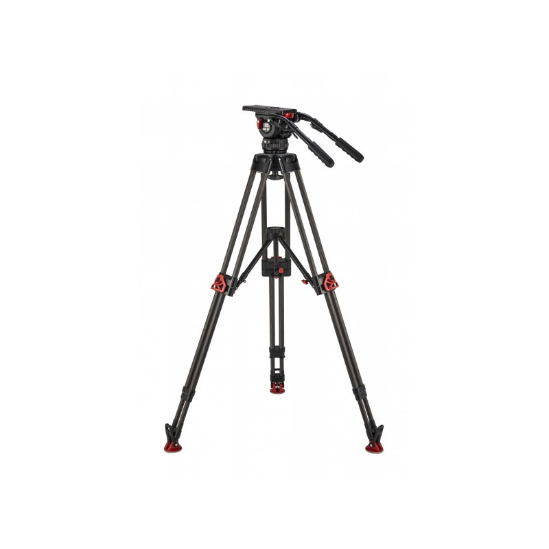 Système de trépied comprenant une tête fluide Elite 18, un trépied en fibre de carbone et un écarteur au sol.