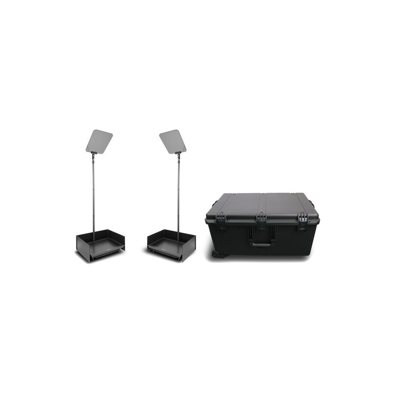 Télésouffleur présidentiel portable Stagepro, paire légère avec moniteurs professionnels haute luminosité de 24" 1000 nits avec entrées 3G-SDI/HDMI, perches en fibre de carbone, verre séparateur optique 65/35 et logiciel Telescroll