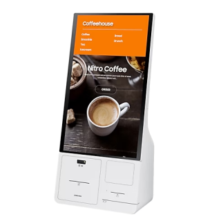 Boîtier de connexion avec imprimante thermique de reçus, lecteur de code-barres (1D, 2D), support pour terminal de paiement électronique. Montable sur bureau, mural ou sur pied. AC 100-240 V - blanc gris.