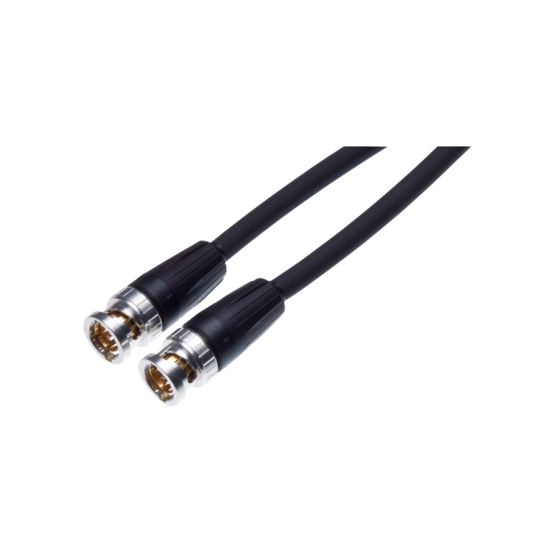 Câble coaxial noir, très flexible 0,6L/2,8 AF (ZNK CT2739600), vidéo numérique SDI, (Atténuation@100MHz/100 m = 12,1dB), avec un diamètre extérieur de 4,5 mm, gaine PVC et 2 connecteurs de câble mâles BNC rearTWIST NBNC75BFG7 avec manchons noirs.