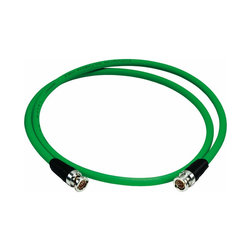 Câble coaxial assemblé, 0.6/2.8 AF FRNC-C (ZNK CT2850202), sans halogène, ignifuge, vidéo numérique SDI, diamètre total 4.5 mm (Attu@100MHz/100m = 10.5 dB), vert, avec 2x BNC rearTWIST NBNC75BFG7, manchons noirs