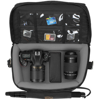 Store, protect and transport your Nikon D850 DSLR or similar camera with up to four lenses and associated accessories with the custom black DSLR messenger-style bag from Porta Brace. This bag features a zip-close top compartment with a front clip loop for your DSLR and lens, as well as a zipped lower compartment for additional lenses or accessories. Included with the bag: two 5x3" padded dividers, a carabiner with torch, a camcorder wedge block and an adjustable padded suede shoulder strap. A feature sure to impress is the built-in anti-glare visor for your iPad. Under the lid are six transparent pockets for memory cards. And under the base of the bag is a pocket for storing a tripod or another accessory. For increased strength and durability, the bag is made from water-resistant 1000D Cordura nylon.