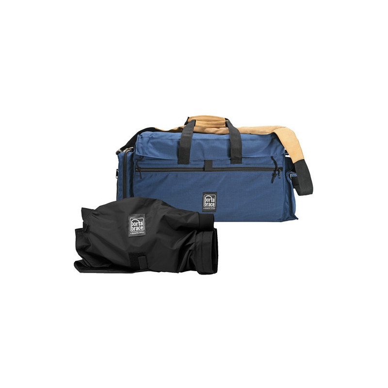 The Porta Brace DVO-3U signature blue large camcorder carrying case with Matte Box and Follow Focus is designed to hold compact Mini DV camcorders and their accessories. It is made of 1000 denier Cordura fabric with a non-slip, easy-to-clean rubber bottom, and rigid dividers. It fits popular mini-DV cameras with additional accessories, including an attached matte box and wireless mics. A camera tie-down strap and soft cradle keep the camera stable. A 1.0" thick soft foam cushion adds extra stability and protection.