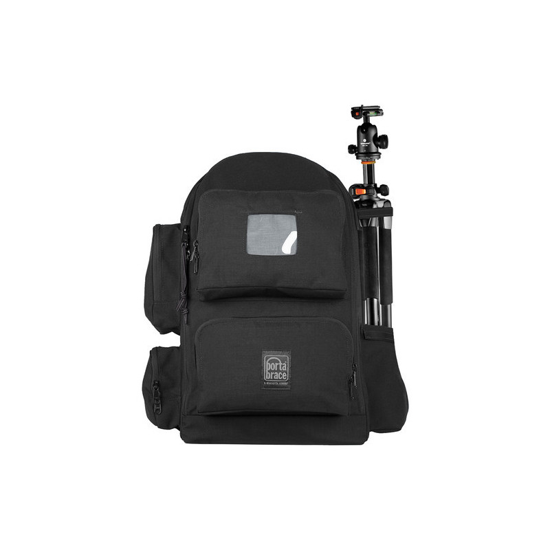 Store, protect and transport your camera and accessories with the black Porta Brace backpack for Canon XF705. This backpack is designed to hold a compact HD video camera and can also be used as a shoulder bag. To protect and organize equipment, the bag features a padded interior divider with hook-and-loop closure. Under the zippered lid of the spacious main compartment are clear pockets for storing thin accessories such as filters, cables and more. The exterior zippered pockets are useful for batteries and other larger peripherals. A handy side pocket allows you to hold the base of a small tripod, light stand or other support equipment. An adjustable strap above this pocket allows you to secure the middle section of the tripod/light stand.