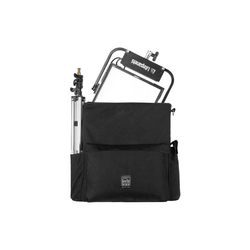 Store, transport and protect your Litepanels Gemini 1x1 and associated equipment in this black carrying case from Porta Brace. The case includes a light stand pocket with strap, a large front pocket for accessories, two interior attachment straps and a carabiner with torch. Photographers will appreciate the Cordura nylon construction and 1.5-inch semi-rigid foam padding. Carry the case using the suede handles or carry it with the padded suede shoulder strap.