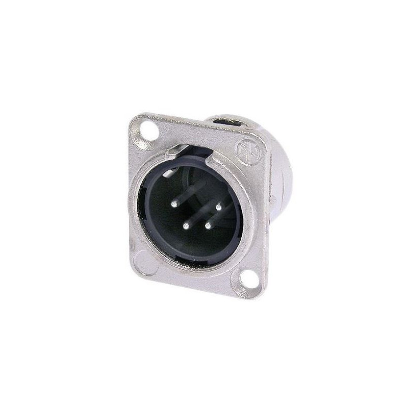 4-pole male receptacle, solder cups, nickel-plated housing, silver-plated contacts.