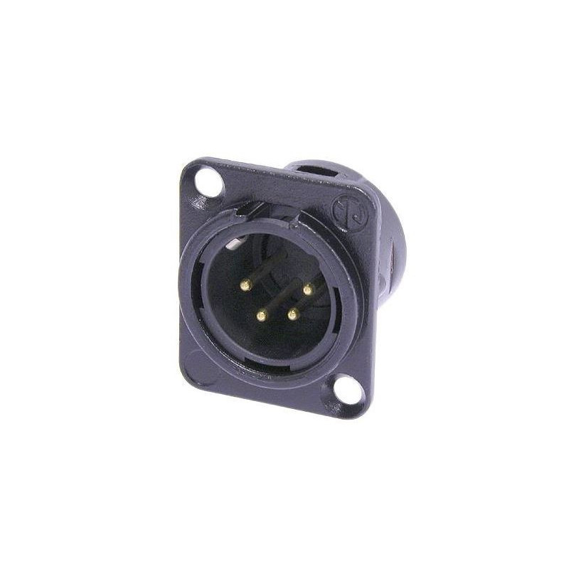 4-pole male connector, solder cups, black metal housing, gold-plated contacts.