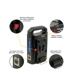 Hedbox PROBANK-2XL is an Intelligent Digital Dual Battery Charger system with two V-Mount (V-Lock) Batteries featuring simultaneous charging and UPS/Power Bank capabilities. LED status indicators provides clear, accurate and precise reporting while integrated support stands ensure stable operation when only one battery is mounted. The included 4-pin XLR female to male DC Power Cable (RPC-DC4X4) enables the PROBANK-2XL to be used as a Power Bank, providing power to the DC output from the AC-input or fitted V-Lok batteries. DC output power of up to 14.5V 4.5A 75W is available.