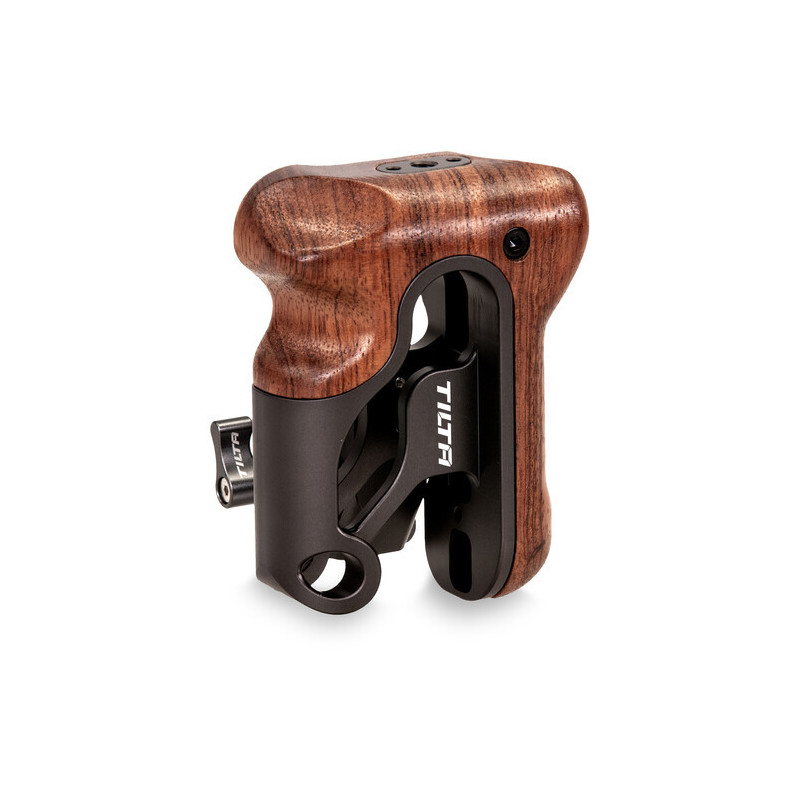 Style and comfort are the hallmarks of this type VI Tiltaing Left-Side Wooden Handle from Tilta, in a Tilta gray aluminum finish. The grip is hand-carved from black walnut wood for an attractive, comfortable, and temperature-stable handgrip that is mounted on an aluminum alloy frame, providing support and strength for mounting accessories.