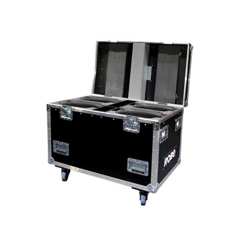 This flight case offers perfect protection for four ROBIN Pointe units for the touring and rental market. It is constructed from 9mm thick high-quality waterproof plywood. It features a black exterior finish and has protected aluminum edges and sturdy steel corners. This quad case is equipped with four recessed metal wheels for easy transport.