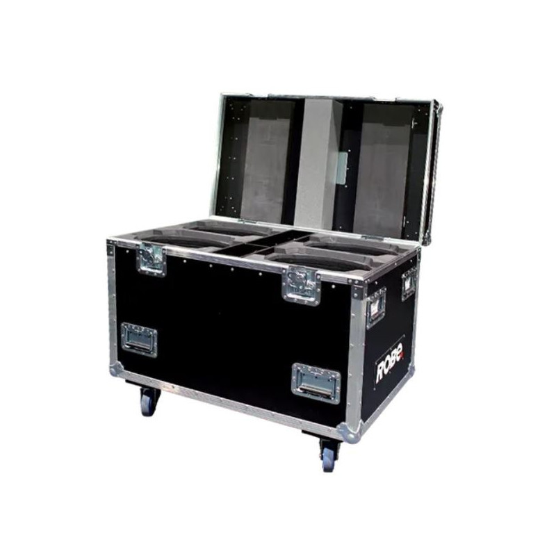 This case offers perfect protection for four ROBIN Pointe units for the touring and rental market. It is made of high-quality, waterproof 9 mm thick plywood. Its exterior is finished in black and features edges protected by aluminium and robust steel corners. This quadruple case is equipped with four recessed metal wheels for easy transport.