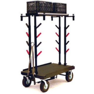 Features: Holds (8) Pieces of Track and 4' x 8' Plywood; Plywood Holders (Adjustable); Detachable Top Shelf Holds (2) Milk Crates; Base Holds (3) Milk Crates; Jockey Box Holds (2) Half Milk Crates; Vertical Posts and Top Shelf are Removable for Transportation; Wheels (2) 10 Swivel Casters & (2) 10 Rigid Casters (Optional (2) 10 Swivel Casters & (4) 10 Rigid Casters); Foot Brake; Pull Bar