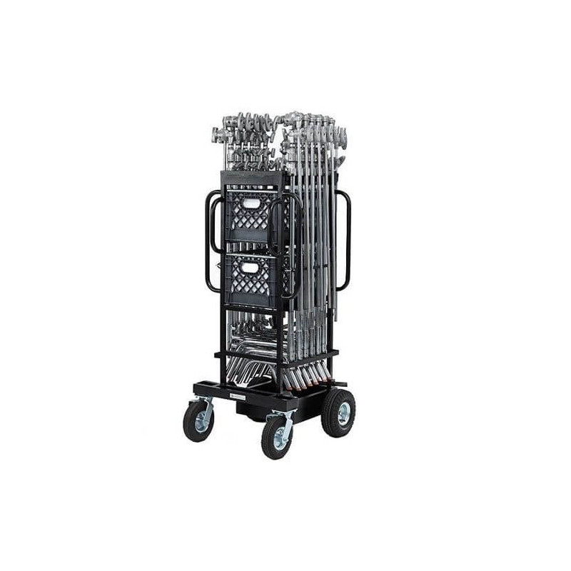 Features: Holds up to 13 C-Stands; Holds (2) Milk Crates; Holds (4) C-Stand Gobo Head and Arms; Holds Sand Bags; Wheels: (2) 10 Pneumatic Offset Wheels & (2) 8 Swivel Casters with Brakes; Hand Brake