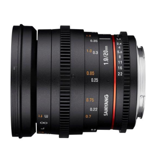 The Samyang 20mm T1.9 ED AS UMC VDSLR is a fast wide-angle lens. The optical structure consists of 13 elements in 12 groups, of which three elements are made of high-quality ED glass with low chromatic dispersion and two elements are aspherical. All lenses feature a UMC-type multi-layer anti-reflection coating that provides exceptional light transmission.