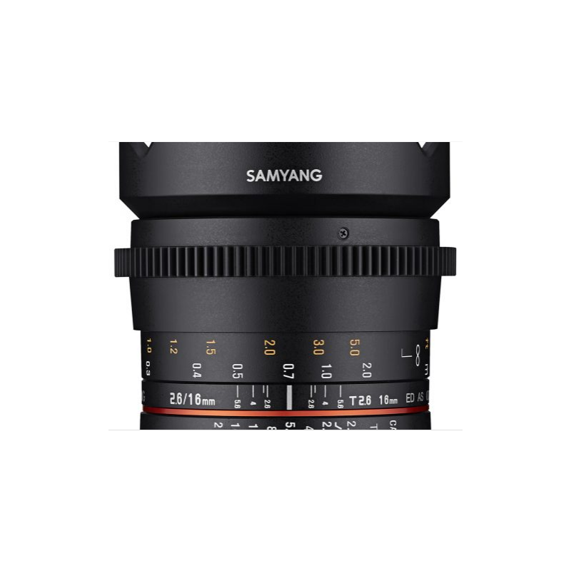Designed for video shooting, the Samyang 16mm T2.6 manual focus lens can be used with professional follow focus systems, thanks to its de-clicked decoupled rings with T-stop values.