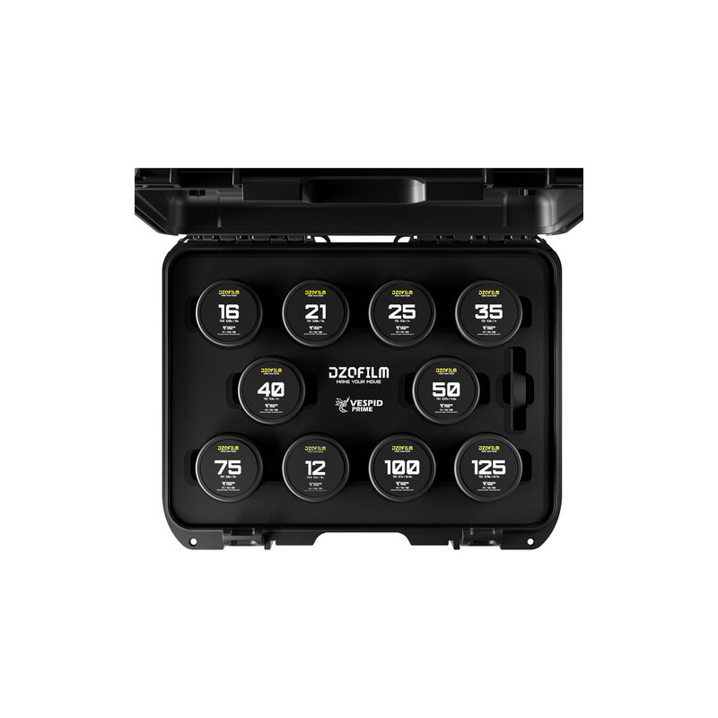 DZOFilm VESPID Prime Cine 10-Lens Kit is suitable for use on productions ranging from independent to studio films. The included 21, 25, 35, 50, 75, 100, and 125mm T2.1, and 12 and 16mm T2.8 PL mount lenses cover full-frame sensors and project a 46.5mm image circle yet are small and lightweight, making them an excellent choice for handheld, gimbal, and drone work