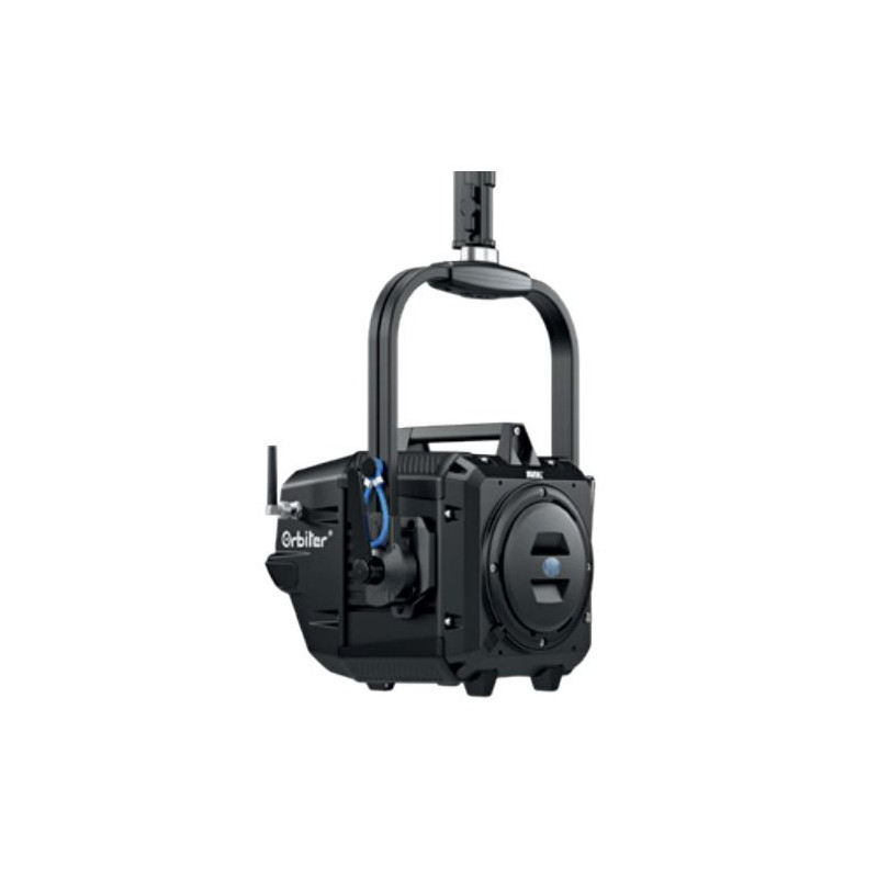 Bring a wide spectrum of brightness and colour to your studio with the ARRI Orbiter Black LED light without yoke, lens and cable, a tuneable colour lighting system featuring a powerful colour engine and versatile interchangeable optics. Equipped with a processor four times faster than the SkyPanel, ARRI's Spectra system with 190 LEDs offers a wide range of colour features allowing you to create an enormous colour palette thanks to its six-colour light engine comprising red, green, blue, amber, cyan and lime LEDs. With a high CRI of 98 and a TLCI of 95, it offers a colour temperature range of 2000 to 20,000 K to suit almost any lighting situation, and also features dimming from 100 to 0% with continuous and progressive adjustment. The light is also equipped with multiple sensors, including an intelligent colour sensor mode to detect ambient light and adjust its output for fine colour accuracy, a 3-axis accelerometer that detects pan, tilt and roll movements, an ambient light sensor to keep your screen readable, heat sensors to keep the light cool, and even a magnetometer to orient your light within its geography. The Orbiter features a highly portable design that can change optics in the blink of an eye thanks to ARRI's Quick Lighting Mount (QLM), a bayonet-type connection similar to a camera lens mount. Available optics include 15, 30 and 60° open-face optics producing a directional beam; 15, 25 and 35° projection optics producing a sharp, focused beam with evenly distributed colour; and small, medium and large domes offering a large soft light surface. The light can also be used with softboxes, barndoors, honeycomb grids and other light shaping accessories available separately with the appropriate adapter. Using ARRI's Lighting Operating System (LiOS), you can control all colour modes, effects and lighting presets directly from the built-in control panel. LiOS offers eight colour modes such as CCT, HSO, RGBACL, gel selection, X/Y coordinates, source matching, effects and a custom mode that allows you to save over 240 favourites that can be applied to a DMX or interface. It also features three operating modes — high colour rendering, high output and low noise — for your preferred performance mode. Interfaces include 5-pin DMX input and output, two LAN ports, two USB Type-A ports, one USB Type-C port and an SD slot for future upgrades. It also features a sync input for future applications that will sync with your camera. The light is weather-resistant and can withstand dust and water splashes. Its redesigned mounting points secure an optional yoke for positioning with +/-90° tilt, and the yoke has a standard Junior pin mounting point of 1 1/8". Orbiter Option Orbiter models include versions without optic; with small, medium and large domes; with 15, 30 and 60° open face; and with 15, 25 and 35° projection. ARRI offers a range of open-face and projection optics (lens housings), domes, softboxes, snoots and barndoors. The interchangeable optics attach quickly and easily to the front of the light using the new QLM (quick lighting mount) system, which works like a giant camera lens mount. Powerful Colour Inside every Orbiter is the Spectra light engine with a processor four times faster than ARRI's SkyPanel series and 125 times more memory, with plenty of room for future feature upgrades. To produce extra-fine colour adjustment, the light engine adds amber, cyan and lime to the standard red, green and blue LED colours in its array of 190 LEDs. Capable of creating hard shadows with defined edges, the Orbiter's engine is 76 times smaller than an ARRI L10 Fresnel but has a higher output while consuming the same amount of power. LiOS (Light Operating System) Building on features first introduced with the SkyPanel, ARRI's LiOS system also offers a simplified DMX mode, over 240 presets, optic recognition, optimised performance modes and multilingual support for worldwide use. Eight different colour modes include CCT, HSI, individual colour, x/y coordinates, gel, source, matching and an ambient colour sensor. Full Sensor Suite The Orbiter features an integrated sensor suite with an ambient colour sensor that reproduces colour and intensity changes in your environment and offers two modes, continuous and momentary. Use momentary mode to get an instant reading of your light levels, or switch to continuous mode to constantly adapt to changing light in an event space, etc. Its 3-axis accelerometer detects pan, tilt and roll of the Orbiter, and this metadata can be used in future applications for placement optimisation and effects production. It also includes a magnetometer that provides true global direction, an ambient light sensor that will automatically dim your control panel screen and a heat sensor that ensures safe operation at any temperature. Durable Construction The Orbiter has an estimated LED lifespan of 50,000 hours. Its optional yoke mounts on a Junior pin, and it consumes 400 W nominally and 500 W maximum. It features aluminium construction with a +/- 90° quick-release yoke, powerful tilt lock and manual operation. A full suite of connectors includes DMX input, DMX output, two LAN ports, one USB Type-A 1.5A port, one USB Type-A 0.5A port, one USB Type-C 1.5A port and an SD card slot.