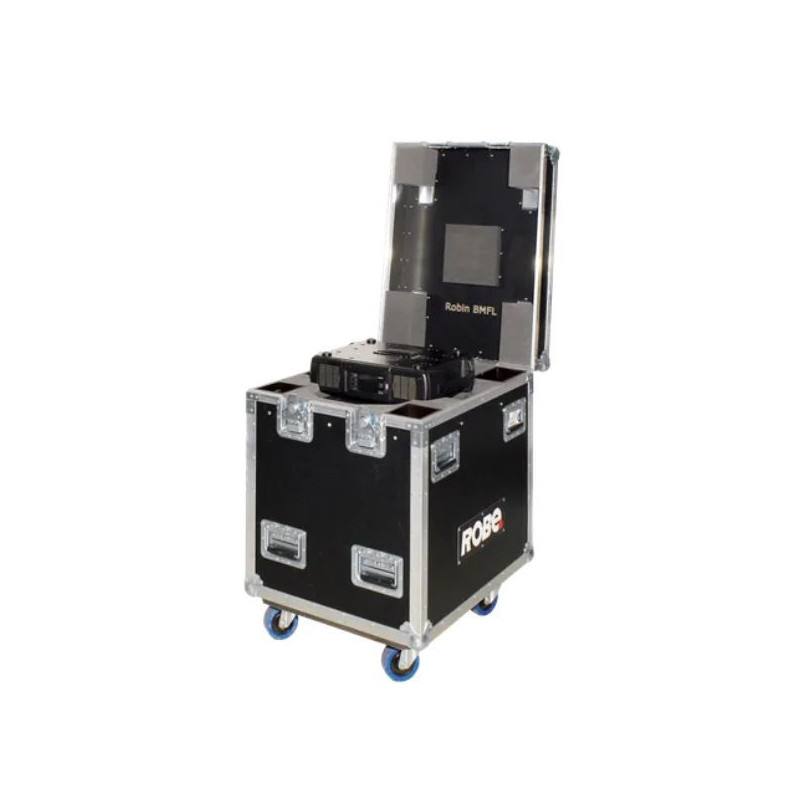 This case offers perfect protection for Robin fixtures in the touring and rental market. It is constructed from 9 mm thick high-quality, water-resistant plywood. It has a black exterior finish and includes protected aluminium edges and sturdy steel corners. This single case is equipped with four recessed metal wheels for easy transport.