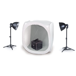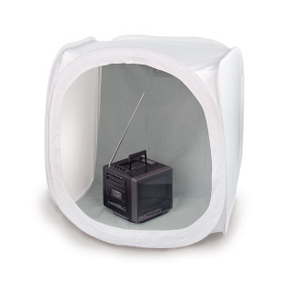 Cubic light tent for uniform and soft illumination of the subject. Removable front cover with slot for the camera lens. Easy to set up, deploys automatically. Very flexible structure, can be folded down to compact format.