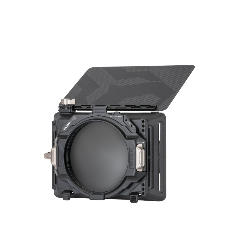 Built robustly for daily use on your camera rig while remaining lightweight for handheld, stabilizer, or drone use, the Tilta Mirage VND Kit is a modular system that attaches to lenses with a 95mm outer diameter. The included variable ND system allows you to precisely adjust the ND effect from 0.3 to 2.7 stops as needed. The matte box weighs about the same as a standard 4 x 5.65" glass filter, and it accepts Tilta's 95mm round filters with the included filter adapter. The modular design means you can configure the matte box to meet your needs shot by shot. The included rigid sunshade and removable top flag help reduce reflections and protect your image from light flares coming from above. Four included lens adapters allow you to mount the Mirage Matte Box on lenses with 67, 72, 77, or 82mm front thread sizes. An optional stackable 4 x 5.65" filter holder allows you to mount 4 x 5.65" filters on the matte box. Other modular components, such as a top flag, dual circular filter holder, filter protector, and rubber donut for filming against windows, are available separately.