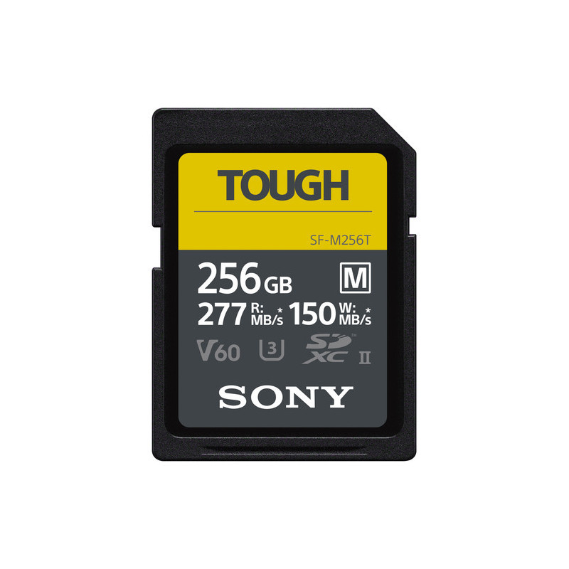 Sony's SF-M Tough series 256 GB SDXC UHS-II memory card offers 256 GB of storage capacity and uses the UHS-II bus to support advanced DSLR functions such as continuous bursts and rapid shooting, as well as RAW and JPEG captures. This card is also well suited to video capture, including 4K, Full HD and 3D video. It can achieve maximum read speeds of 277 MB/s and maximum write speeds of 150 MB/s. Thanks to its V60 speed rating, write speeds are guaranteed not to drop below 60 MB/s.