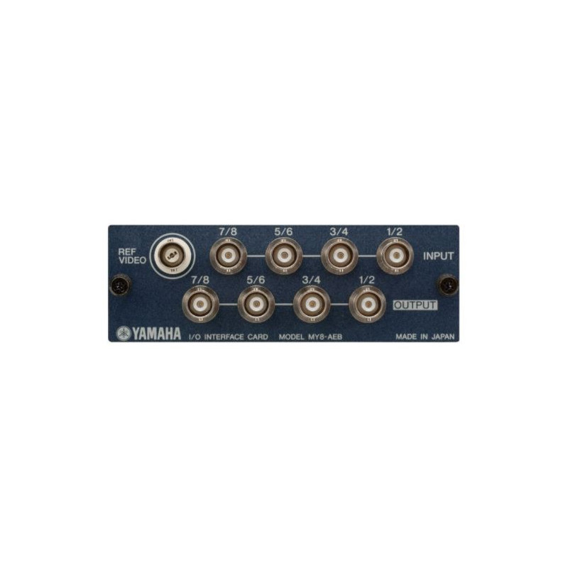 The Yamaha MY8-AEB is an eight-channel AES/EBU digital audio input/output interface for compatible Yamaha digital audio products. It features four stereo inputs and four stereo outputs in the form of 75 Ohm BNC connectors. A REF video input is also provided to receive an NTSC or PAL reference video signal allowing the reference clock of the device in which the MY8-AEB is installed to be synchronised.