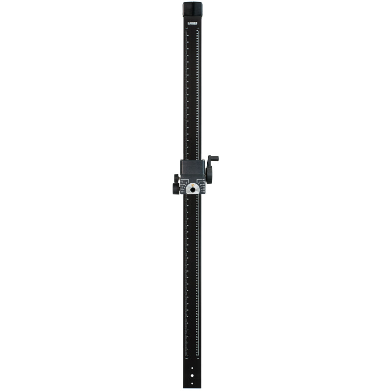 Wide and extremely vibration-resistant column of aluminium tubing with dull black anodized surface and cm and inch scales. Height adjusted by friction gear with plastic bearings, weight compensated by built-in roller spring, locking screw for fixing height adjustment. Height: 1.5 m (60 in.)