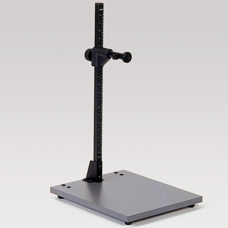 Super-compact camera stand for small, lightweight cameras (APS, digital compacts, CCD cameras, etc.). Non-reflective, matt-black baseboard. Column with cm/inch scale. Height-adjustable camera arm. 1/4” mounting thread.