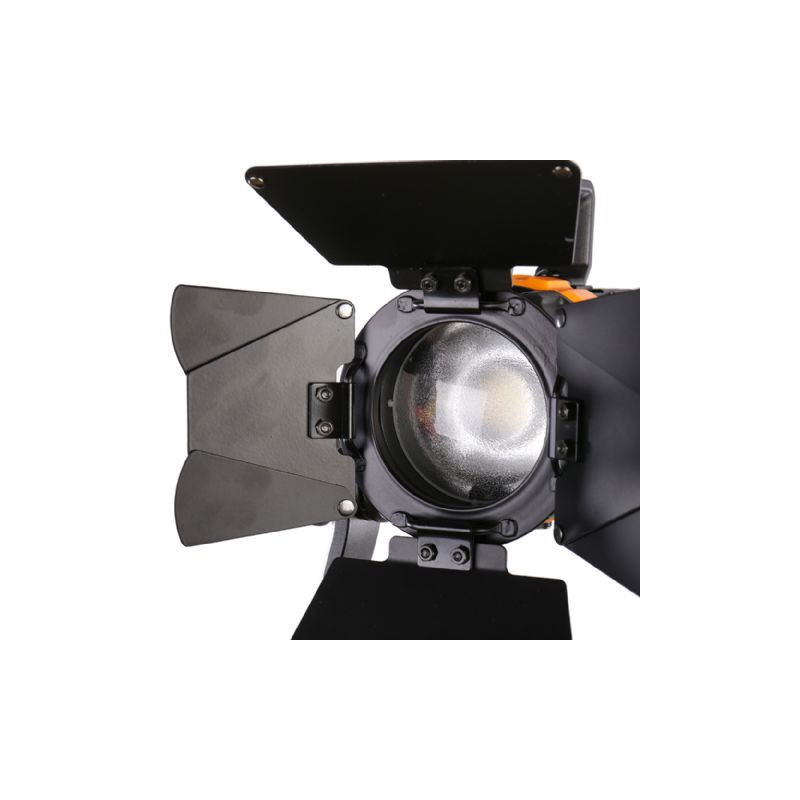 The Falcon Eyes P5AD is a mini LED Fresnel lamp, perfect for ENG productions (outdoor productions), small studios and interviews thanks to its small size. The 50W power is perfectly utilised, thanks to the Fresnel filter, creating a beautiful powerful 5600K light spot. The P5AD has an orange band on the lamp that allows you to adjust the angle of the light beam and simultaneously increase or decrease the range. The controller has a digital display for adjusting brightness. And since the P5AD is a Bi-Color lamp, the colour temperature can also be adjusted with the same controller. The P5AD lamp comes with a handle on top for easy handling, plus an L-bracket is included allowing you to adjust the angle of the lamp and place it on a tripod. On the bottom is a standard spigot connection, making the P5AD lamp compatible with almost all lamp stands. There is a V-mount connection on the controller.