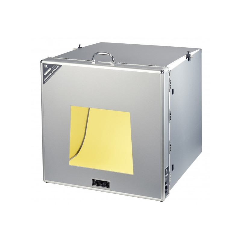 Scope of supply: desktop studio, mains lead, background cardboards (white, gray, black, yellow, blue, pink), two double clamps to attach the background cardboard, crossbar with two clip-on mounts, two spare fuses and storage bag