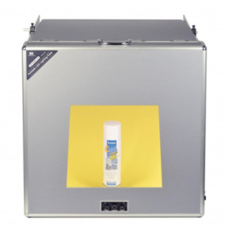 The desktop studio is set up in no time at all: The silver reflecting side panels and the top and bottom panels, silver reflecting as well, are folded open, the background carrier is erected and a background cardboard attached to it.