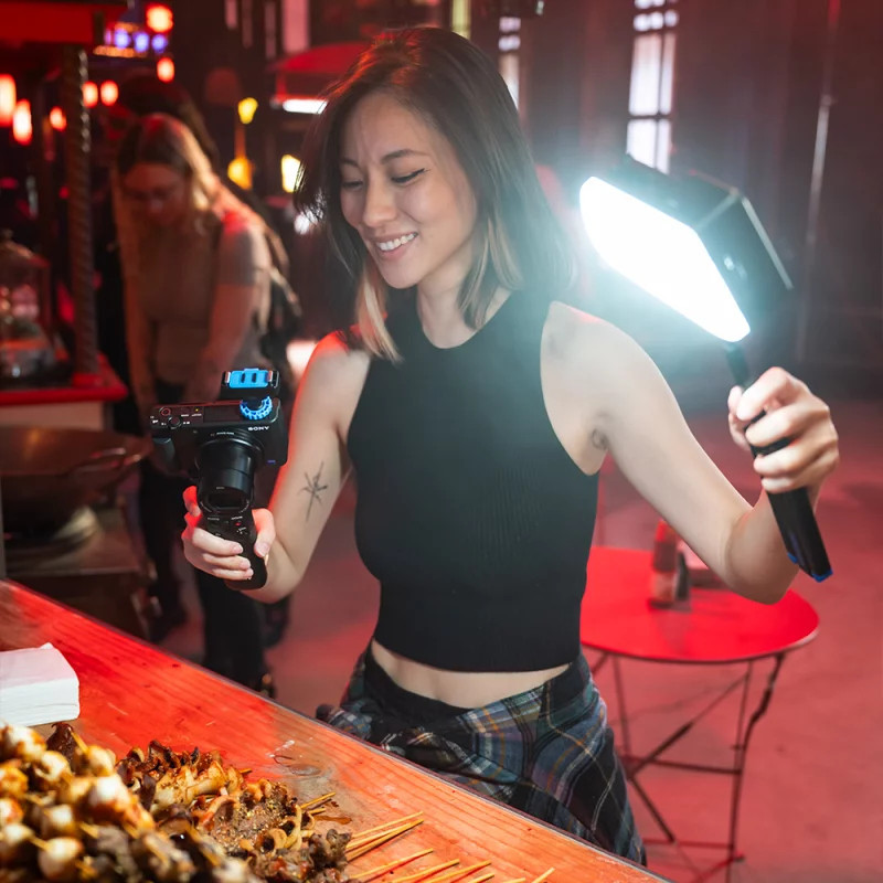 Assembled for content creators, vloggers, and influencers, this white Ace 25x Bi-Color LED Light Panel All-in-One Creator Kit from amaran bundles the versatile and lightweight LED light panel with a 30° grid, mini tripod, lock-to-cold shoe adapter, carrying bag, and other accessories.