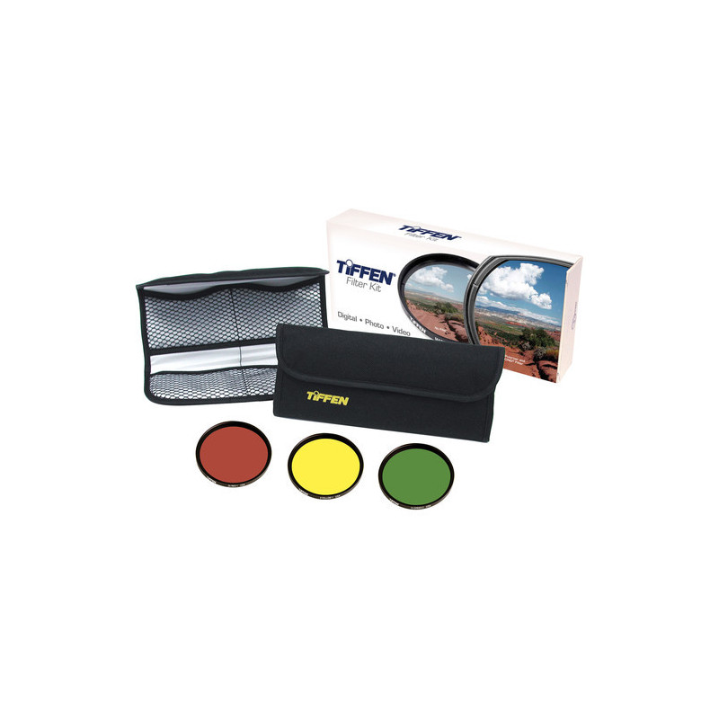 The Tiffen 49mm Black and White Three Filter Kit combines the essential Yellow #6, Green #13 and Red #25 contrast filters, with a four-compartment pouch, to provide a convenient solution for producing different degrees of contrast when working with black and white film.