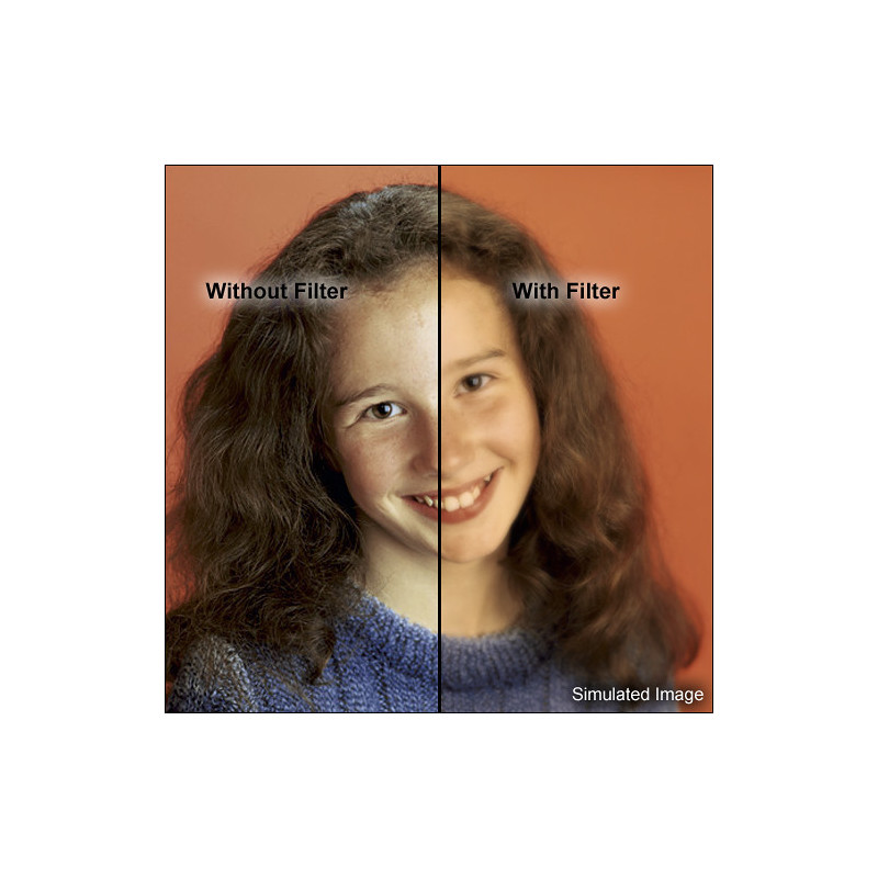 Reduces the appearance of blemishes and wrinkles; softens fine lines and textures; maintains overall sharpness; adds warmth to the entire image when used in daylight on a film camera system with daylight film, or on a digital camera system with its white balance setting on daylight |