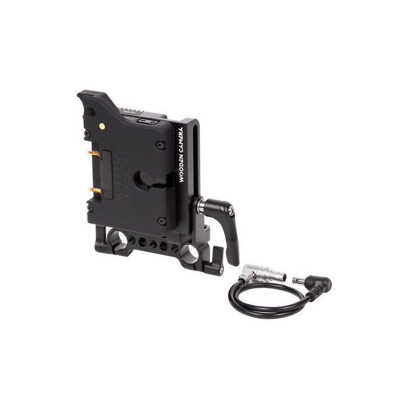 The plate supports one Gold mount battery while leaving access to the camera's standard battery compartment, and it powers the camera using the included 3-pin LEMO-type connector cable.
