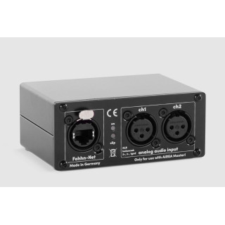 Input: 2× Analog Audio (XLR female, symmetric) and 1× FOHHN®-NET (RJ45 jack), 1× DC 10-48V (for power supply) Output: 1× AIREA®-NET (RJ45 jack), 1× AES/EBU (XLR male)