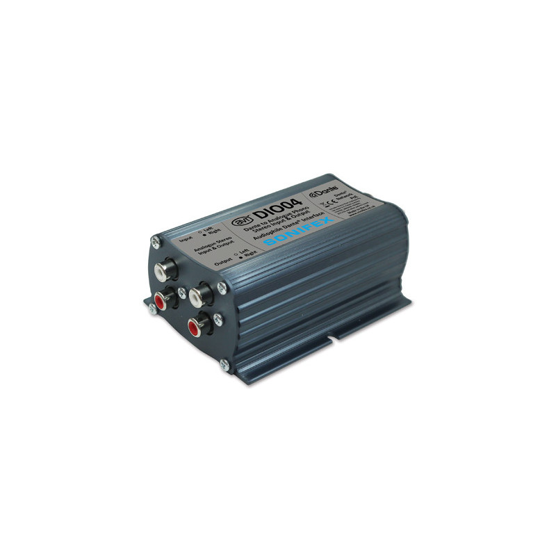The AVN-DIO04 is a Dante to analogue phono stereo input & output convertor in the Sonifex DIO range of Dante input/output devices.