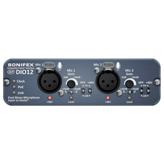 The AVN-DIO12 is a dual microphone input to Dante converter with adjustable mic gain in the Sonifex DIO range of Dante input/output devices.