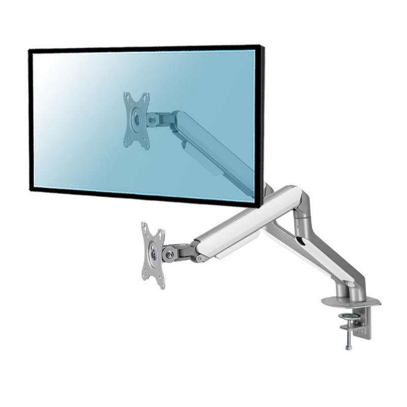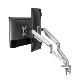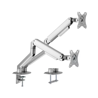 Full Motion desktop support for 2 PC screens 17"-32", Vesa 75x75 or 100x100mm, Spring adjustment mechanism, Ultra-adjustable screens, Installation at the edge of the table or across the table, Gray and white colors .