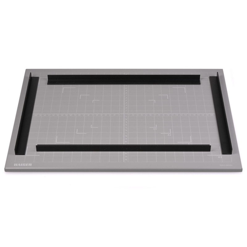 Metal base plate with non-slip bottom surface. Top surface has matt grey lacquer with 18 % reflection for determining exposure times. Printed grid lines with scales and DIN format markings. Wall mounting is possible