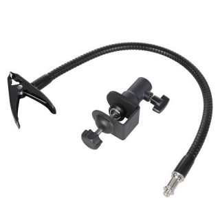 The Falcon Eyes NCPG-30S + CL-35FL Table Clamp and Suspended Clamp consists of a bendable arm equipped with a small spring clamp on one end and a table clamp on the other end.