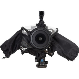 Universal rain protection cover for small handheld photo/video/film & mirrorless cameras including lens extension and storage pouch.