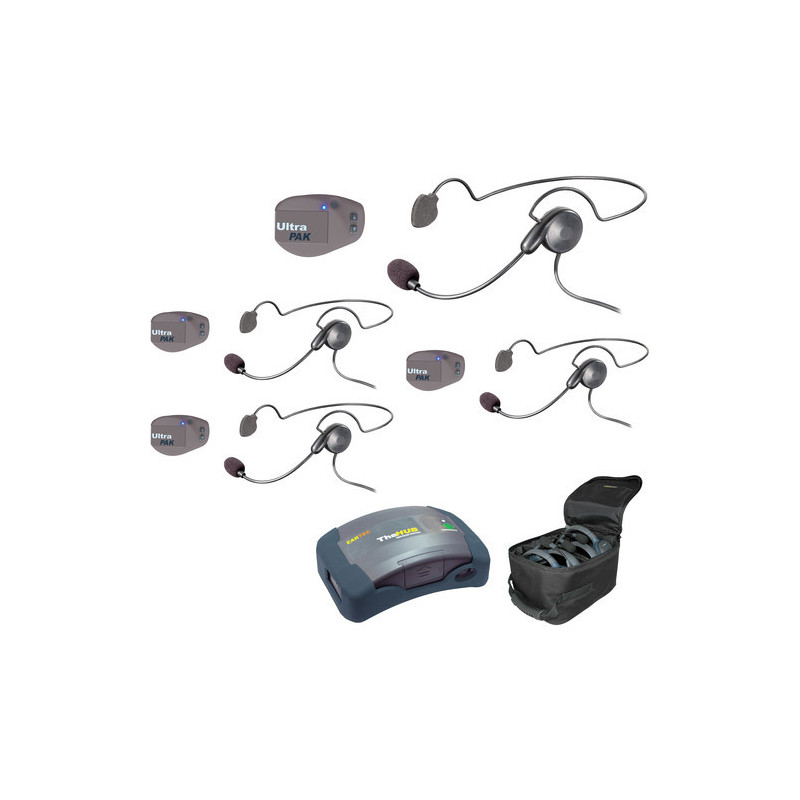 The Eartec UPCYB4 is a professional full-duplex intercom for 4 people who need to communicate and work hands-free. This compact system includes a Mini HUB base to be placed on site or worn on the belt. Also included are 4 UltraPAK belt packs with lightweight Cyber headsets. The UltraPAK uses enhanced digital wireless technology (DECT) to provide professional simultaneous wireless communication within a quarter-mile radius. No FCC licence required.