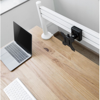 Kit barra di fissaggio tipo Slatwall, 120cm + 2 gambe per tavolo + Supporto schermo girevole, Lunghezza 120cm, Scelta di installazione sul bordo del tavolo o attraverso il tavolo, supporto schermo articolato, Peso massimo consentito 40 kg, bianco.