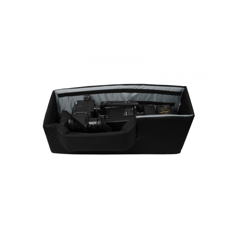Sono inclusi due blocchi di schiuma per fornire maggiore stabilità per l'obiettivo e la fotocamera all'interno della custodia. Il CC-HD1V contiene una videocamera con batteria integrata e la maggior parte delle configurazioni wireless collegate. È dotato di una protezione rigida per il mirino per una protezione e sicurezza extra. La custodia può essere riposta nel bagagliaio di un'auto o nel retro di un furgone, oppure può essere fissata saldamente sul sedile posteriore utilizzando una cintura di sicurezza e la cinghia di fissaggio integrata.