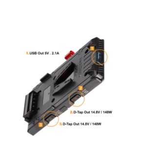 Tre (3) uscite di alimentazione DC D-Tap forniscono 14,8V / 10A per dispositivi e periferiche aggiuntivi come registratori incorporati, luci LED, monitor, controlli di messa a fuoco remoti, trasmettitori wireless, ecc.