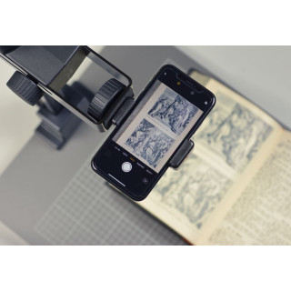 Piano di base grigio opaco non riflettente con griglia stampata fine e scala cm/pollici. Colonna in tubo di alluminio anodizzato nero opaco con scala cm/pollici. Regolazione dell'altezza tramite manovella con trasmissione a frizione su cuscinetti in plastica. Con braccio fotocamera regolabile orizzontalmente per modificare la distanza dalla colonna, si sposta di circa 7 cm (2,7 pollici) avanti e indietro. Filettatura di montaggio 1/4"". La colonna si ripiega sul piano di base.