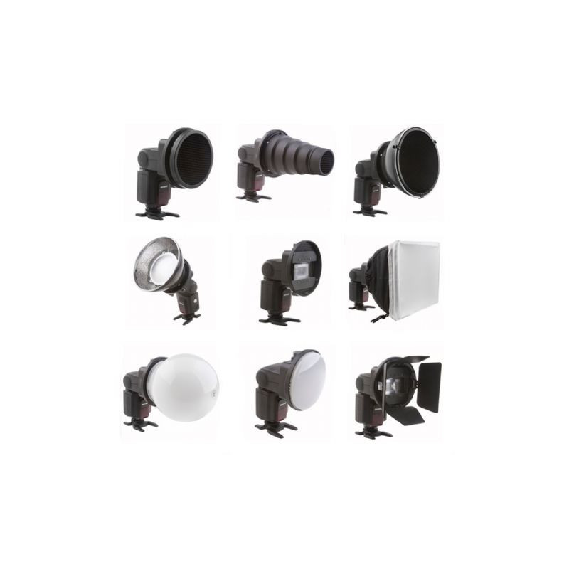 | Tipo : | Diffusore, Adattatore flash, Kit alette, Snoot conico, Sfera di diffusione, Riflettore parabolico, Griglia a nido d'ape, Softbox | |