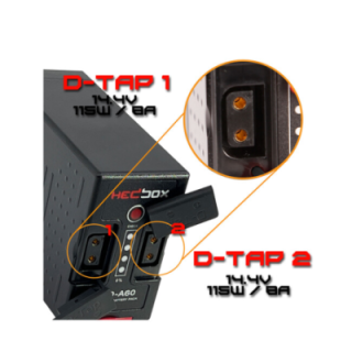 Una doppia presa di uscita DC D-tap è installata sulla parte superiore della batteria HED-A60. Con questa alimentazione esterna, è possibile collegare due prodotti diversi, come una lampada LED per fotocamera e un monitor video o un trasmettitore wireless e un registratore digitale, e ottenere un'alimentazione simultanea con la batteria collegata alla fotocamera, o separatamente come stazione di alimentazione autonoma. L'orientamento opposto dei connettori D-Tap offre maggiore flessibilità nell'uso quotidiano. La potenza massima dei due D-tap è di 95W.